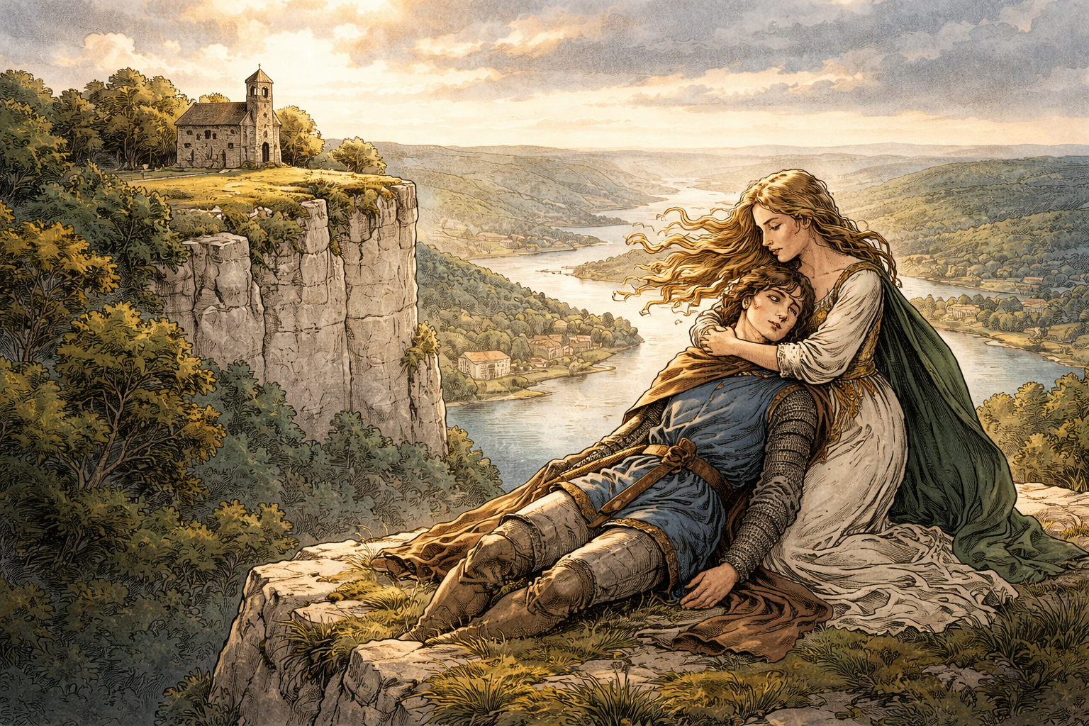 Le chevalier accepte. Il s’élance sur le sentier pierreux qui monte vers le ciel. Rien ne semble fléchir son courage ; les premiers ressauts sont franchis, le pas demeure ferme. Mais l’effort est surhumain. Presque arrivé, il chancelle, s’effondre. La jeune fille tente de le relever : il est déjà mort d’épuisement. Dans un geste désespéré, elle l’étreint et se précipite avec lui du haut de la falaise. Accablé, le père aurait fait édifier sur le plateau une chapelle funéraire, devenue plus tard le prieuré des Deux-Amants, dont le souvenir traverse encore les siècles.